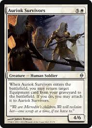 When Auriok Survivors enters the battlefield, you may return target Equipment card from your graveyard to the battlefield. If you do, you may attach it to Auriok Survivors.