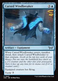When Cursed Windbreaker enters, manifest dread, then attach Cursed Windbreaker to that creature. (Look at the top two cards of your library. Put one onto the battlefield face down as a 2/2 creature and the other into your graveyard. Turn it face up any time for its mana cost if it's a creature card.)