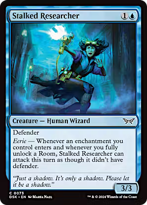 Eerie - Whenever an enchantment you control enters and whenever you fully unlock a Room, Stalked Researcher can attack this turn as though it didn't have defender.