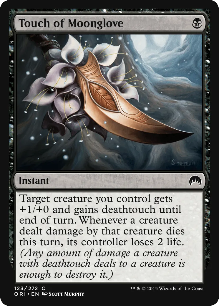 Target creature you control gets +1/+0 and gains deathtouch until end of turn. Whenever a creature dealt damage by that creature dies this turn, its controller loses 2 life. (Any amount of damage a creature with deathtouch deals to a creature is enough to destroy it.)